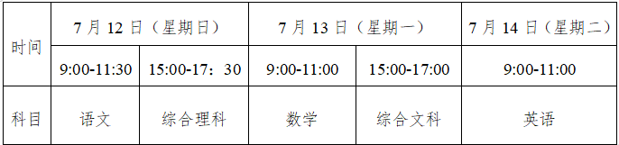 2.考试时间。语文、数学、英语、综合理科(理化合卷)、综合文科(政史合卷)考试时间为7月12日—14日,具体安排如下:
